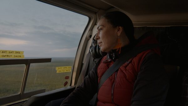 Tanya Talaga flying over Kistachowan sipi (Albany River) by helicopter.Rodrigo Michelangeli/CBC GEM