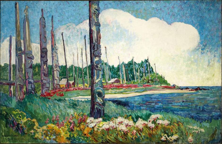 Wandering among the 100 or so oil paintings, watercolours, drawings and preparatory sketches at the AGO the other day, it was easy to see why From the Forest to the Sea did, indeed, prove a revelation at Dulwich. Carr was presented not as some talented hick from the sticks but as a well-travelled artist, trained in San Francisco, London and Paris, whose best work at once incarnated and transcended the techniques of Impressionism, Post-Impressionism, Fauvism, art nouveau and sundry other “isms” of modernity. At the same time, her content – dense, dark, fecund rain forests, totem poles and war canoes, aboriginal villages, tremulous skies, driftwood-scattered beaches, gyrating branches and thrusting trunks – had to have seemed as exotic to the Brits as Gauguin’s depictions of Tahiti or the jungle fever dreams of Henri Rousseau.