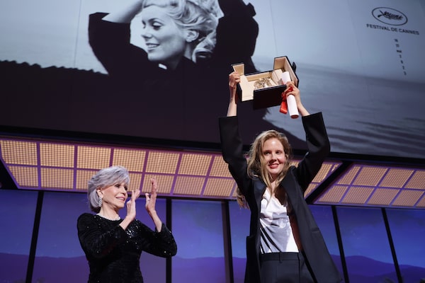 Justine Triet, right, receives The Palme D'Or Award for 'Anatomy of a Fall' from Jane Fonda, left, during the closing ceremony during the 76th annual Cannes film festival at Palais des Festivals on May 27, in Cannes, France.Pascal Le Segretain/AFP/Getty Images