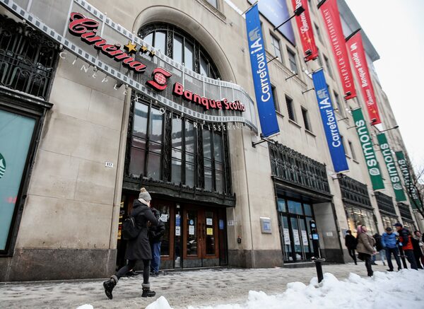 People walk past a movie theatre in Montreal, one of the few cities in the country currently allowing cinemas to operate, on Feb. 27, 2021.CHRISTINNE MUSCHI/Reuters