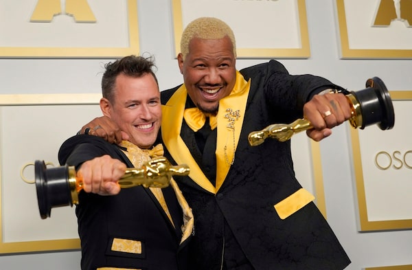 Martin Desmond Roe, left, and Travon Free pose with award for best live action short film for Two Distant Strangers at the Oscars on April 25, 2021.Chris Pizzello/The Associated Press