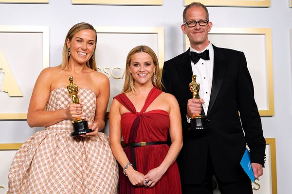 Reese Witherspoon poses with the winners of the Award for Animated feature film for Soul Dana Murray, and Pete Docter at the Oscars on April 25, 2021.POOL/The Associated Press