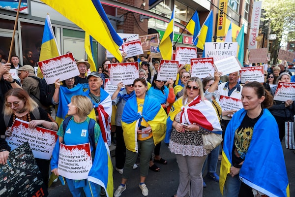 Protesters gather outside the Toronto International Film Festival (TIFF) screening of 'Russians at War', a documentary about Russian troops fighting in Ukraine, in Toronto on Sept. 10.Carlos Osorio/Reuters
