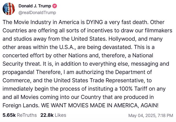 Donald Trump's Truth Social post about the movie industry from May 4, 2025.