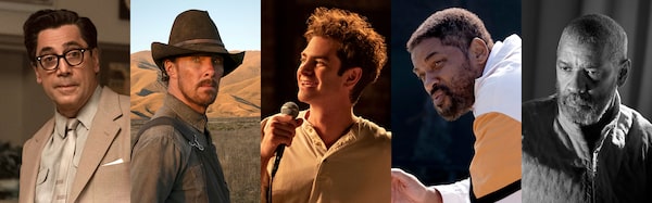 This combination of photos shows the Best Actor Oscar nominees: from left, Javier Bardem in Being the Ricardos, Benedict Cumberbatch in The Power of the Dog, Andrew Garfield in Tick, Tick ... Boom!, Will Smith in King Richard, and Denzel Washington in The Tragedy of Macbeth.Amazon/Netflix/Netflix/Warner Bros./A24 via AP