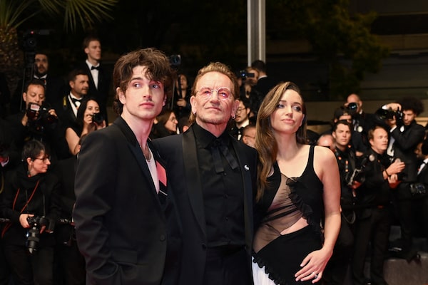 Bono poses with his children, Irish musician Elijah Hewson (L) and Jordan Hewson as they arrive for the screening in Cannes.BERTRAND GUAY/AFP/Getty Images