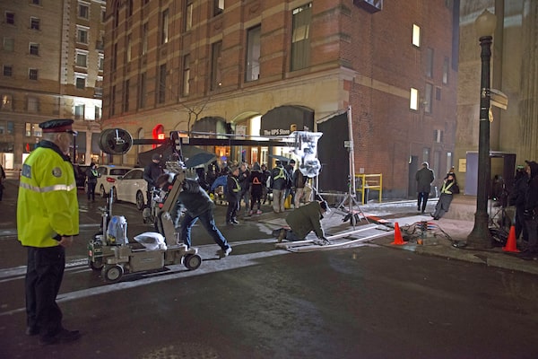 A crew works on a film set on a Toronto street as a police officer looks on, on April 17, 2019.Doug Ives/The Canadian Press