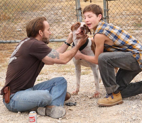Joe (Nicolas Cage) keeps his id on a chain in his driveway. First time you see it, you might think it's a dog – a fierce, beautiful, brown-and-white spotted American bulldog – but as soon as he unleashes it on another dog in a whorehouse you know the truth: The dog's a symbol for the beast in the man.