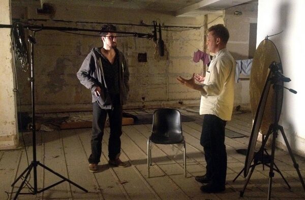 Amir Taaki and Alex Winter on the set of Deep Web, a documentary focusing on Ross William Ulbricht’s arrest and trial.