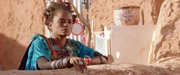 The blend of horror and absurdity is embodied in the character of a Haitian woman (Kettly Noël), a refugee from the 2010 earthquake, a voodoo priestess who wears long flowing clothes and carries a pet rooster under her arm. In one scene, she casts a spell on Abdelkerim with a small cloth bracelet that causes him to go into a tai-chi chicken dance; the dance is intercut with glimpses of a young couple, buried up to their necks, as they are stoned to death for adultery.