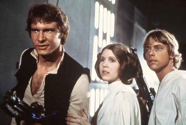 Harrison Ford, Carrie Fisher, and Mark Hamill in a scene from the 1977 Star Wars.