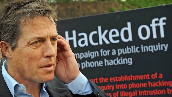 British actor Hugh Grant outside the Houses of Parliament in London, where a debate was being held into the allegations of phone hacking by journalists Wednesday July 6, 2011.Stefan Rousseau