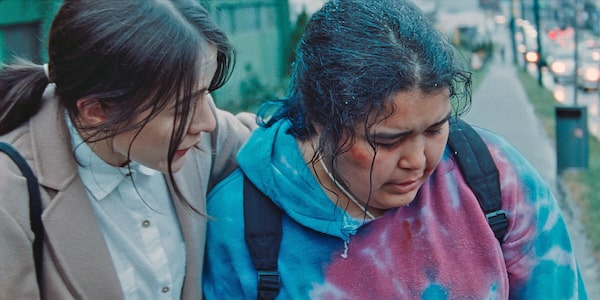 Áila (Elle-Máijá Tailfeathers) consoles a young woman (Violet Nelson) she finds barefoot and sobbing in the streets.Experimental Forest Films