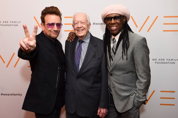 Carter poses with Bono and Nile Rogers at a gala on April 29, 2016.Shahar Azran/Courtesy of We Are Family Foundation / Films We Like