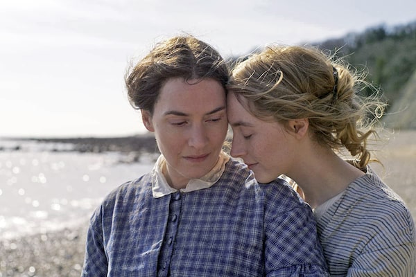 The film opens on the 1840s Southern English coastline, where the self-taught Mary (Kate Winslet) ekes out a living by selling rinky-dink fossils to tourists, with her most famous discoveries stripped of her name in London museums. Saddled with caring for her cranky widowed mother (Gemma Jones) and with no friends to speak of, Mary seems uniquely able to relate to the relics she finds on the sands of Lyme Regis: She is a woman out of time, forgotten and unloved. But then, Charlotte Murchison (Saoirse Ronan) walks into Mary’s life, in the company of her dour and dire husband Roderick (James McArdle), and the two women strike a business arrangement, then a friendship, then something more.