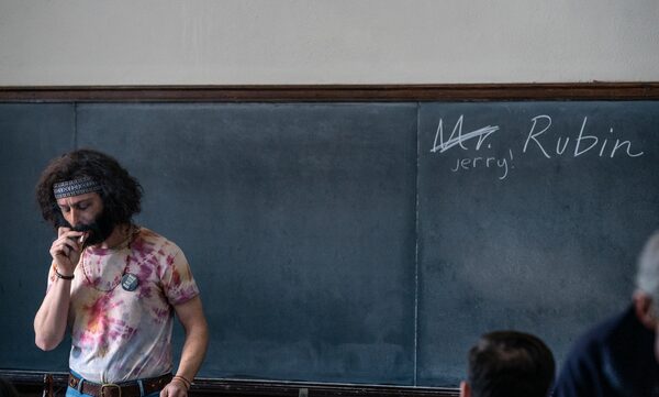 Strong evokes Otto the Bus Driver from The Simpsons as Jerry Rubin, yet the performance works.Niko Tavernise/Netflix