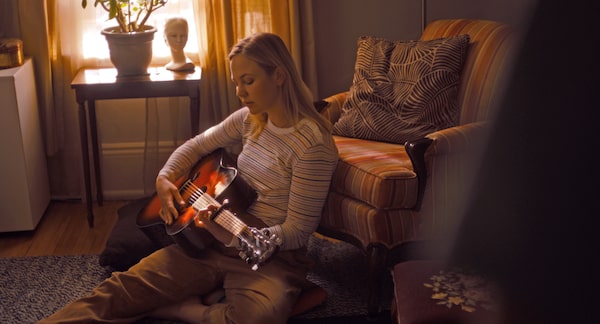 The script, by Kate Hewlett (based on her play), announces its intention to disarm the moment we fade in, as a litany of filthy lyrics pours forth from the angel-faced, angel-voiced Carey (Adelaide Clemens, from the limited series Under the Banner of Heaven), who’s put together a concert at a bar to celebrate her husband Simon’s (Patrick J. Adams) 40th birthday. Her guitarist, Owen (Douglas Smith) keeps giving her puppy eyes, but Carey is singing about a good marriage, and we can tell she means every word.