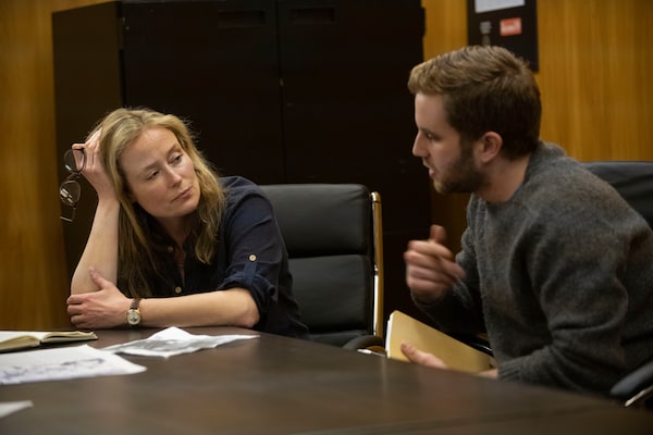 Actor Jennifer Ehle's character, left, actively discourages the hot stories at a news meeting.Courtesy of Elevation Pictures
