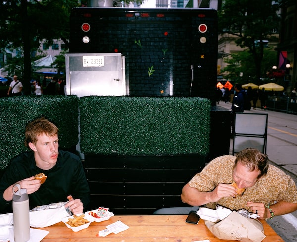 Festival-goers eating on 'festival row,' the unofficial name for King Street West during TIFF.