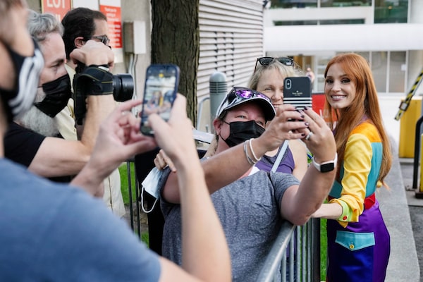 Actor award recipient Jessica Chastain takes a selfie with a fan after a news conference for the 2021 TIFF Tribute Awards in Toronto on Sept. 11, 2021.MARK BLINCH/Reuters