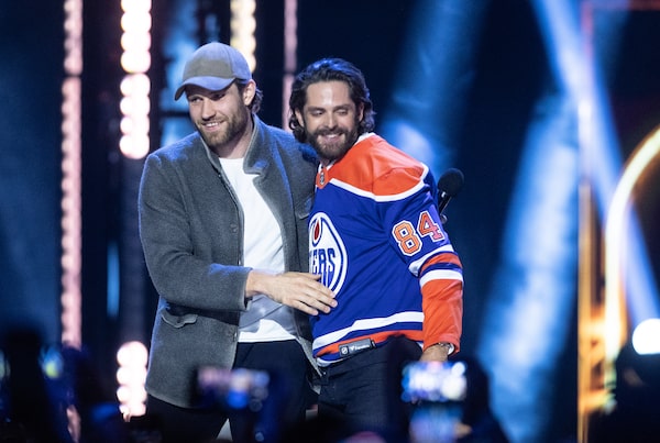 Edmonton Oilers' Leon Draisaitl, left, gives a jersey to host Thomas Rhett during the CCMA Awards in Edmonton on Saturday, September 14, 2024.JASON FRANSON/The Canadian Press