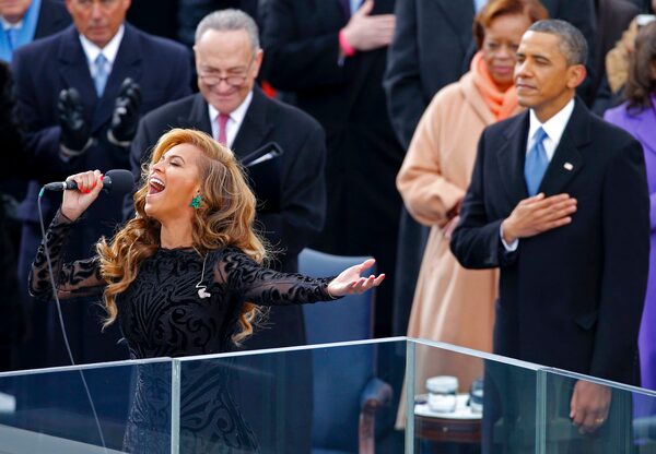 Beyonce sings the U.S. National Anthem as former President Barack Obama, right, and Senator Charles Schumer listen during swearing-in ceremonies on the West front of the U.S. Capitol in Washington, Jan. 21, 2013.JIM BOURG/X90054