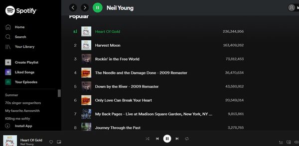 According to Spotify, Young has 6,154,216 monthly listeners on the service. To put that in perspective, Drake has 53,495,360 monthly listeners and Joni Mitchell has 3,732,448. There’s a perception that streaming services are mostly used by younger listeners, but 19 per cent of the user base is aged 55 or over, compared with 26 per cent under age 24, according to Spotify.