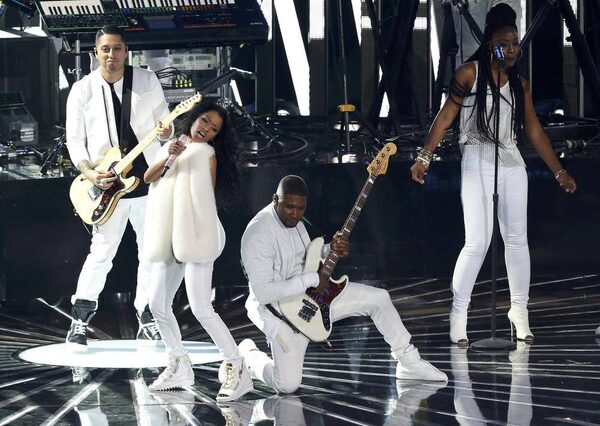 Usher performs "She Came to Give It to You" with Nicki Minaj (2nd L) backstage during the 2014 MTV Video Music Awards in Inglewood, California August 24, 2014.MARIO ANZUONI/Reuters
