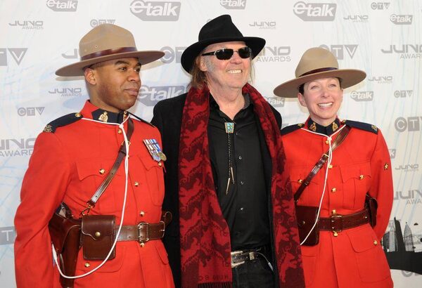 Neil Young poses with Mounties as he arrives on the red carpet during the Juno Awards in Toronto, Ont. March 27/2011.Kevin van Paassen