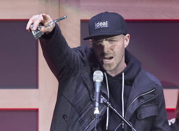 Classified addresses the crowd after winning the song of the year award for ‘No Pressure’ at the 2017 East Coast Music Awards gala in Saint John, N.B. on April 27, 2017.Andrew Vaughan/The Canadian Press