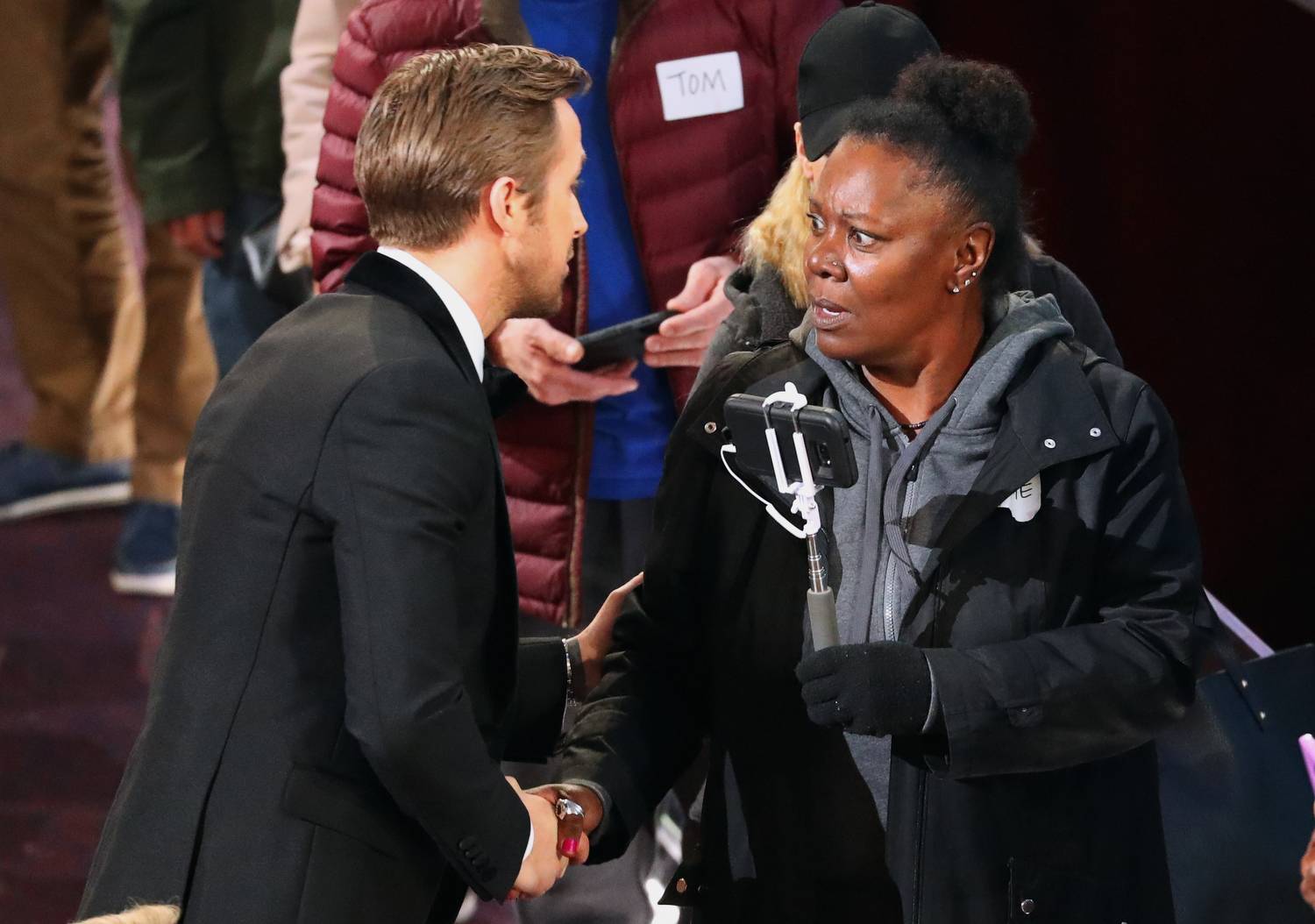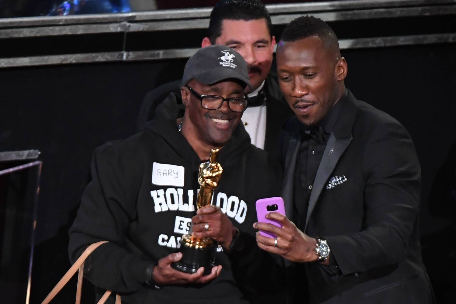 A tourist brought into the Oscars as a surprise meets with Best Supporting Actor winner Mahershala Ali.Mark Ralston/AFP / Getty Images
