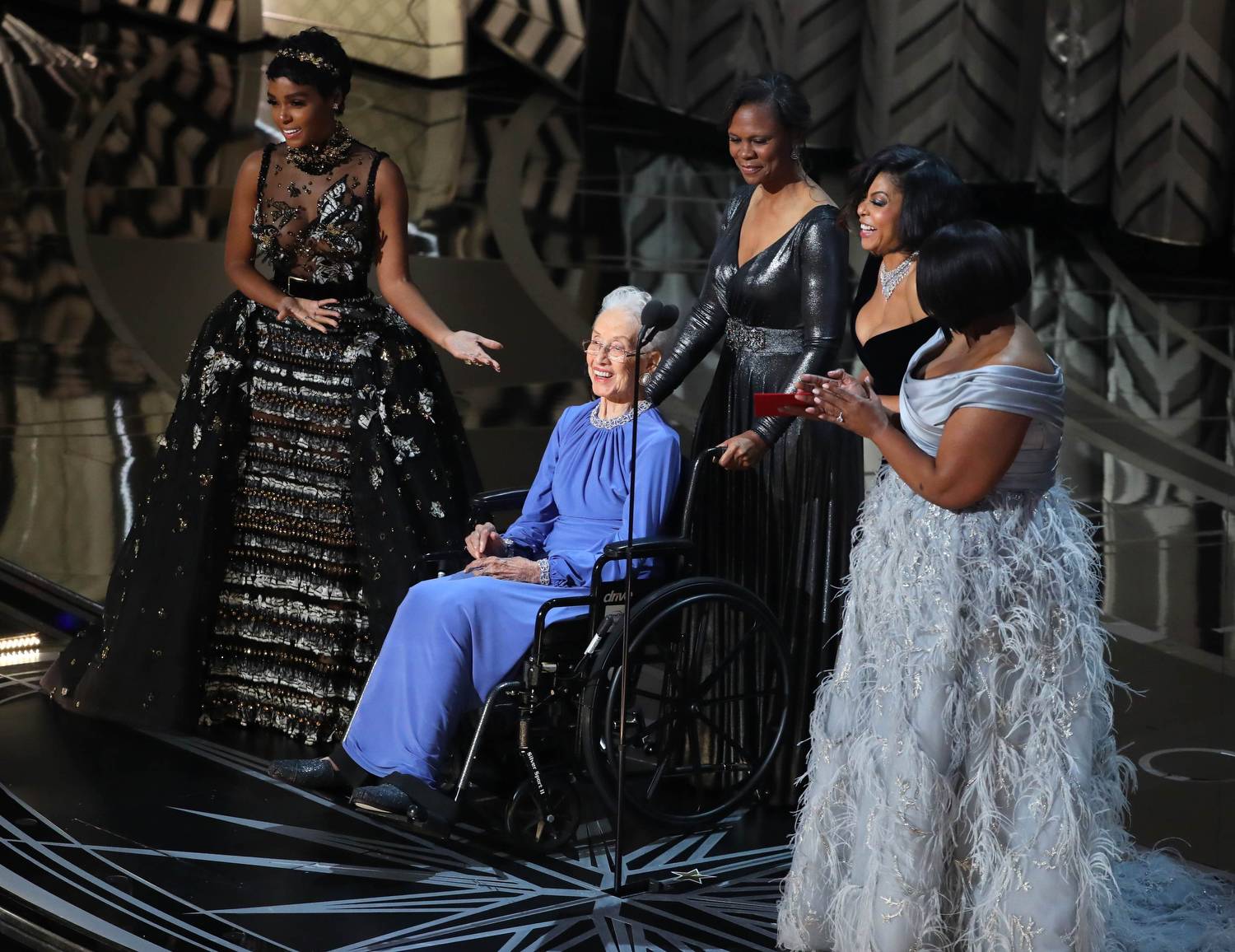Taraji P. Henson , Octavia Spencer (R), Janelle Monae (L) and Katherine Johnson (in wheelchair) present for Best Documentary Feature.Lucy Nicholson/Reuters