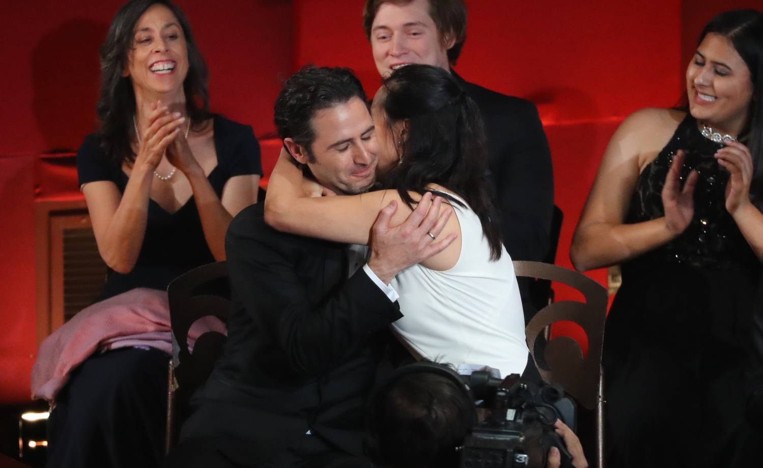Director Damien Chazelle kisses his partner Olivia Hamilton after he won the Best Director award for "La La Land."Mark Ralston/AFP / Getty Images