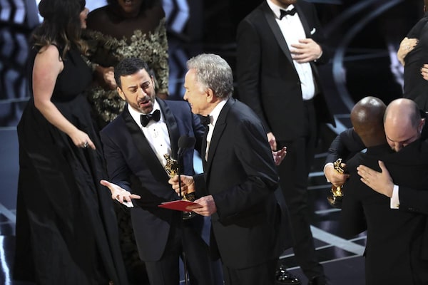 Jimmy Kimmel questions presenter Warren Beatty after he showed the card for Best Picture winner "Moonlight" after "La La Land" was incorrectly presented the Oscar.Patrick T. Fallon/The New York Times