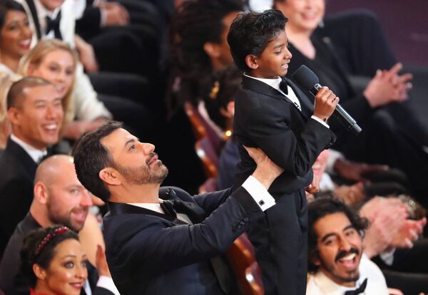 Host Jimmy Kimmel lifts Sunny Pawar.Lucy Nicholson/Reuters