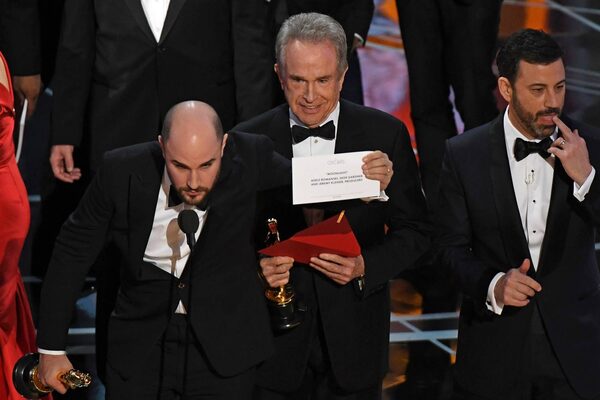 US actor Warren Beatty (C) shows the card reading Best Film 'Moonlight" after mistakingly reading "La La Land."Mark Ralston/AFP / Getty Images