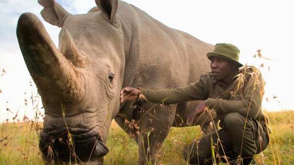James Mwenda strokes a northern white rhino in Kenya.Lee Jackson/BBC / Courtesy of PBS