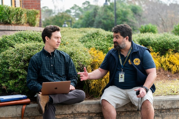 Alvarez, left, appears with Sean Patton in a scene from English Teacher. Patton, playing a good-humoured conservative gym teacher, answers the challenge of making a gun-loving southerner lovable.Tina Rowden/Courtesy of FX