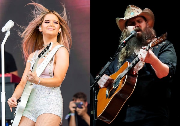 Maren Morris performs at the Bonnaroo Music and Arts Festival in Manchester, Tenn., on June 15, 2019, left, and Chris Stapleton performs during Marty Stuart's Late night Jam at the Ryman Auditorium in Nashville on June 7, 2018./The Associated Press