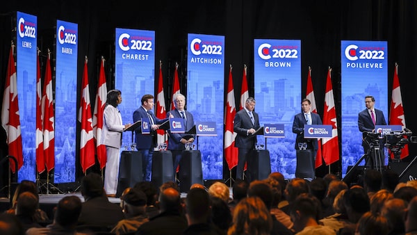 Candidates, left to right, Leslyn Lewis, Roman Baber, Jean Charest, Scott Aitchison, Patrick Brown, and Pierre Poilievre at the Conservative Party of Canada English leadership debate in Edmonton on May 11.Jeff McIntosh/The Canadian Press