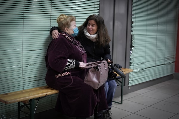 Colombian television journalist Catalina Gomez, working for France 24, comforts and checks the welfare of a female refugee who has just arrived at Hungary's Zahony train station from Ukraine on March 7.Christopher Furlong/Getty Images