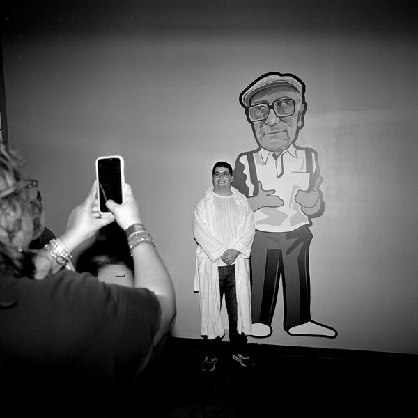 A fan in a Tony Soprano bathrobe has his picture taken next to a large drawing of Junior Soprano.