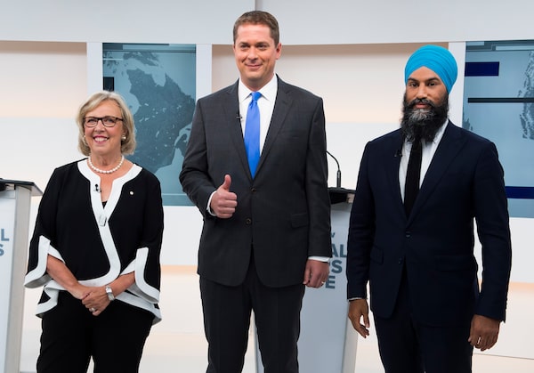 Green Party Leader Elizabeth May, left, Conservative Leader Andrew Scheer, centre, and NDP Leader Jagmeet Singh pose for a photograph before the Maclean's/Citytv National Leaders Debate in Toronto on Thursday, Sept. 12, 2019.Frank Gunn/The Canadian Press