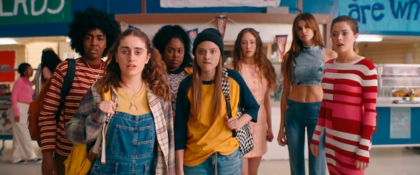 A scene from Bottoms showing, from left, Ayo Edebiri, Rachel Sennott, Zamani Wilder, Summer Joy Campbell, Havana Rose Liu, Kaia Gerber and Virginia Tucker.Courtesy of ORION Pictures Inc./The Associated Press