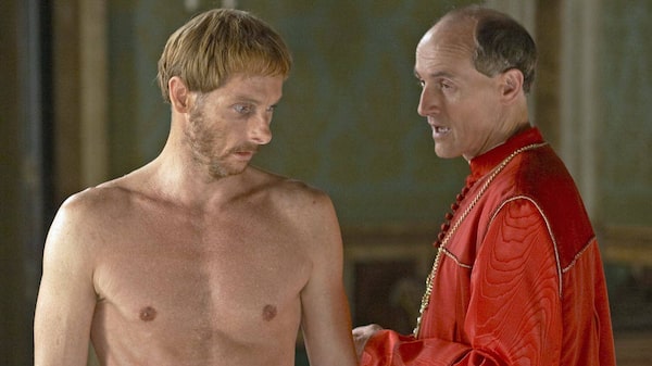 Sean Harris as Micheletto and Colm Feore as Cardinal Della Rovere in The Borgias.