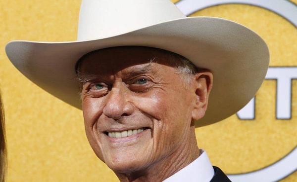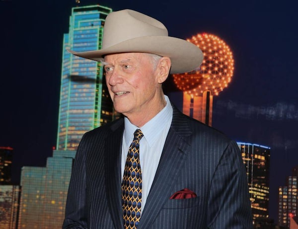American actor, director and producer, Larry Hagman, best known for his role as "J.R. Ewing" from the TV series Dallas poses for a photo in front of a backdrop with an image of downtown Dallas, during a reception at the University of Texas at Tyler, following his presentation of "Confessions" on Nov. 10, 2012. Mr. Hagman, who for more than a decade played villainous patriarch JR Ewing in the TV soap Dallas, has died at the age of 81, his family said Saturday Nov. 24, 2012.Dr. Scott M. Lieberman/The Associated Press