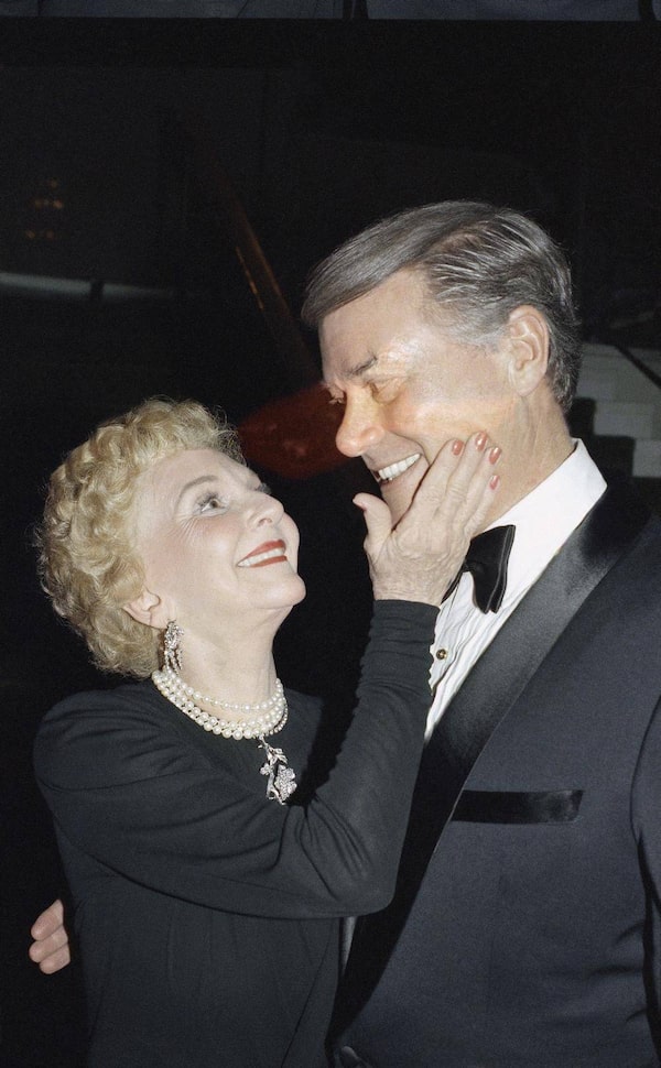 In this Sunday, Feb. 3, 1986 file photo, actress Mary Martin touches the cheek of her son, Larry Hagman, also a famous actor, at the after-theater party for "Legends," a play starring Martin and Carol Channing, at the Music Center in Los Angeles. Actor Larry Hagman, who for more than a decade played villainous patriarch JR Ewing in the TV soap Dallas, has died at the age of 81, his family said Saturday Nov. 24, 2012.Reed Saxon/The Associated Press