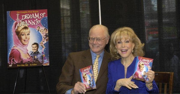 In this Wednesday, March 15, 2006 file photo, "I Dream of Jeannie" co-stars Barbara Eden and Larry Hagman pose for photos before signing copies of the newly-released first season DVD of their television show at a bookstore in New York. Mr. Hagman, who for more than a decade played villainous patriarch JR Ewing in the TV soap Dallas, has died at the age of 81, his family said Saturday Nov. 24, 2012.Jason DeCrow/The Associated Press