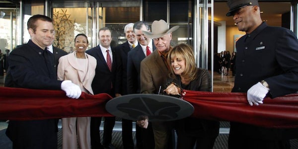 Linda Gray cuts the ribbon as Larry Hagman holds the ribbon at the grand opening of the Omni Dallas Hotel on Friday, November 11, 2011. In the background, Hattie Hill, Chairman of the Dallas Convention & Visitors Bureau, Jack Matthews, Former Dallas mayor Tom Leppert, and Dallas Mayor Mike Rawlings look on. Hagman, who for more than a decade played villainous patriarch JR Ewing in the TV soap Dallas, has died at the age of 81, his family said.David Woo/The Associated Press