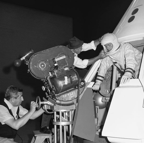 In this June 4, 1965 file photo, from left, cameraman Sam Rosen and director Gero Nelson guide the co-star of the series "I Dream of Jeannie," Larry Hagman, as he emerges from a mockup of the Apollo space vehicle, filming at North American Aviation's Space Division in Downey, Calif.Anonymous/The Associated Press